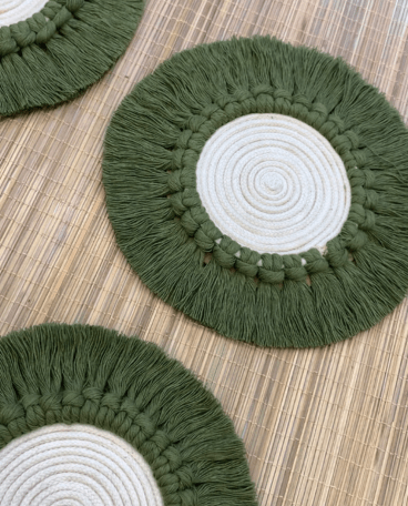 Handcrafted 6-inch round macramé coaster in sage green and off white cotton with fringe border