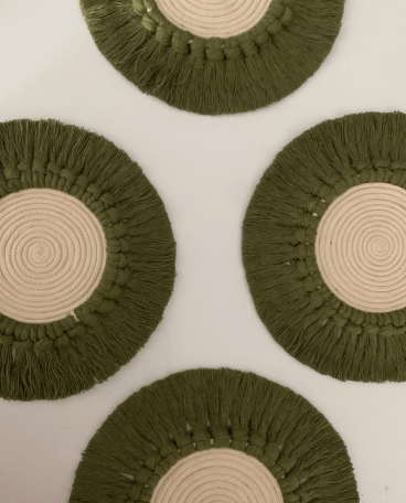 Bring a touch of artisan elegance to your table with the Sage Haven macramé coaster, handcrafted from premium cotton macramé cord. Featuring an off white spiral center surrounded by a lush sage green fringe, this 6-inch round coaster beautifully combines functionality with refined texture. Each piece is carefully knotted by skilled artisans, making it a perfect stand-alone accent for tea time, coffee breaks, or gifting. Durable, absorbent, and easy to care for, it adds natural warmth and mindful style to any setting.
